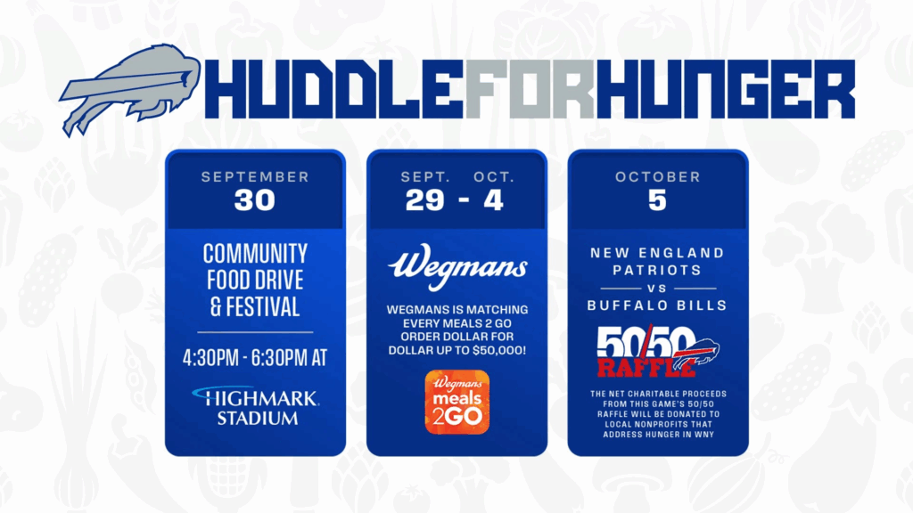From Sunday, September 28 through Sunday, October 5, fans can take part in the Buffalo Bills Foundation’s 50/50 Raffle, with net charitable proceeds donated to the 20 Huddle for Hunger charities.